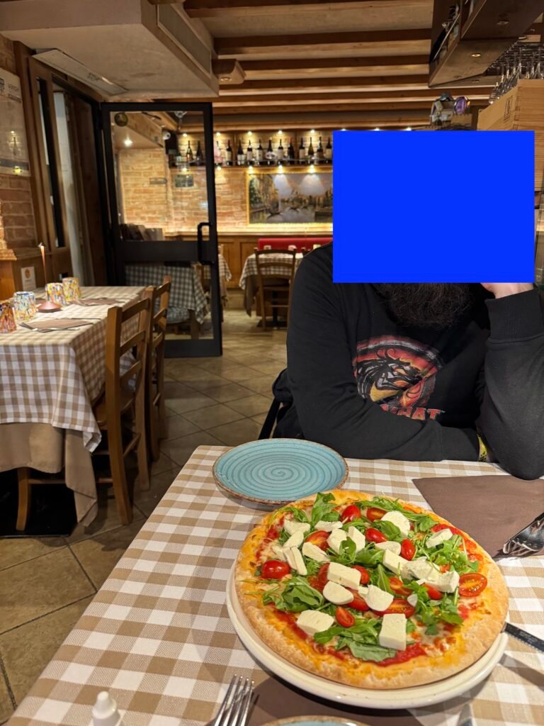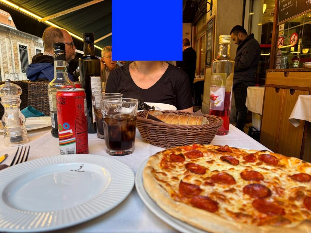The pizza tasted like the Schär dough we often eat at home. Given that the location is in San Marco (a notoriously high-cost part of Venice) and it cost only 16€ (with friendly service staff), this is not the place for us to complain about the pizza taste, maybe.