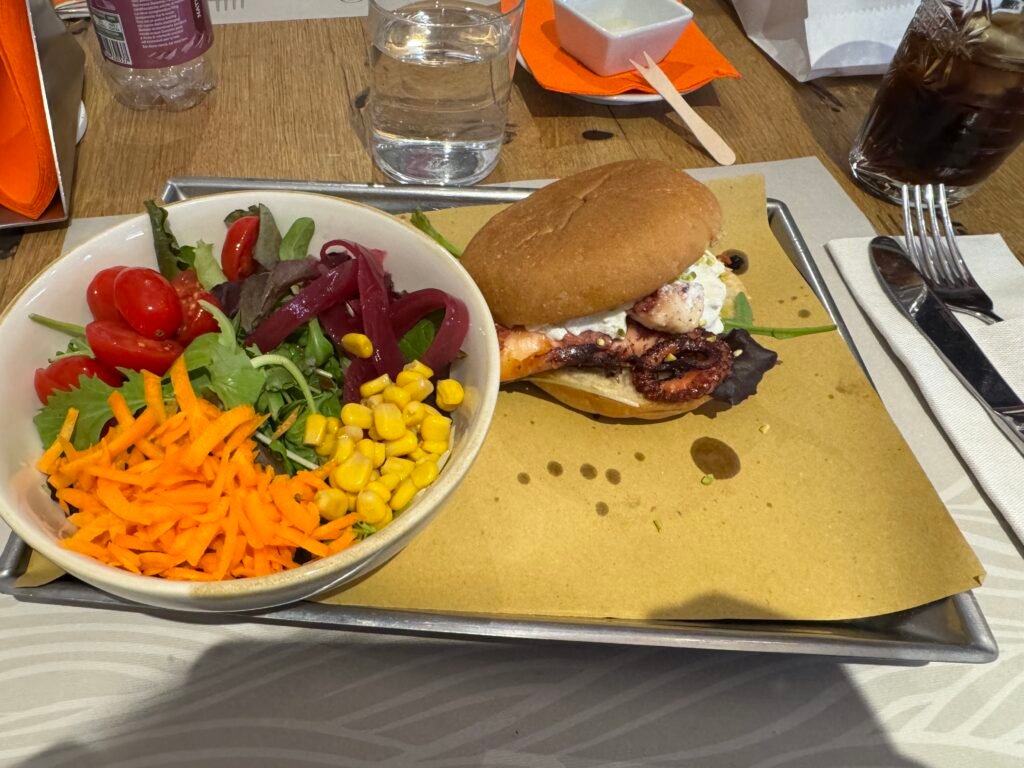 We also grabbed a gluten-free octopus burger accompanied by a green salad bowl, which was very eye-opening. We haven’t had such a burger before.